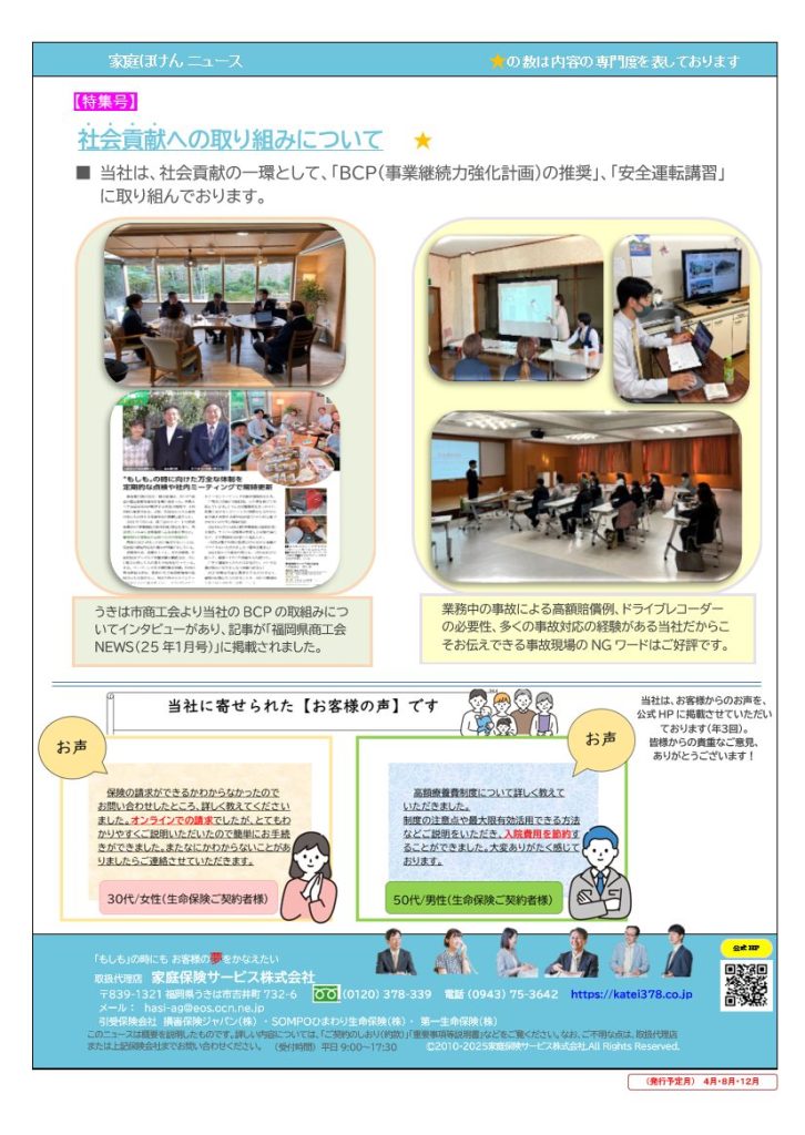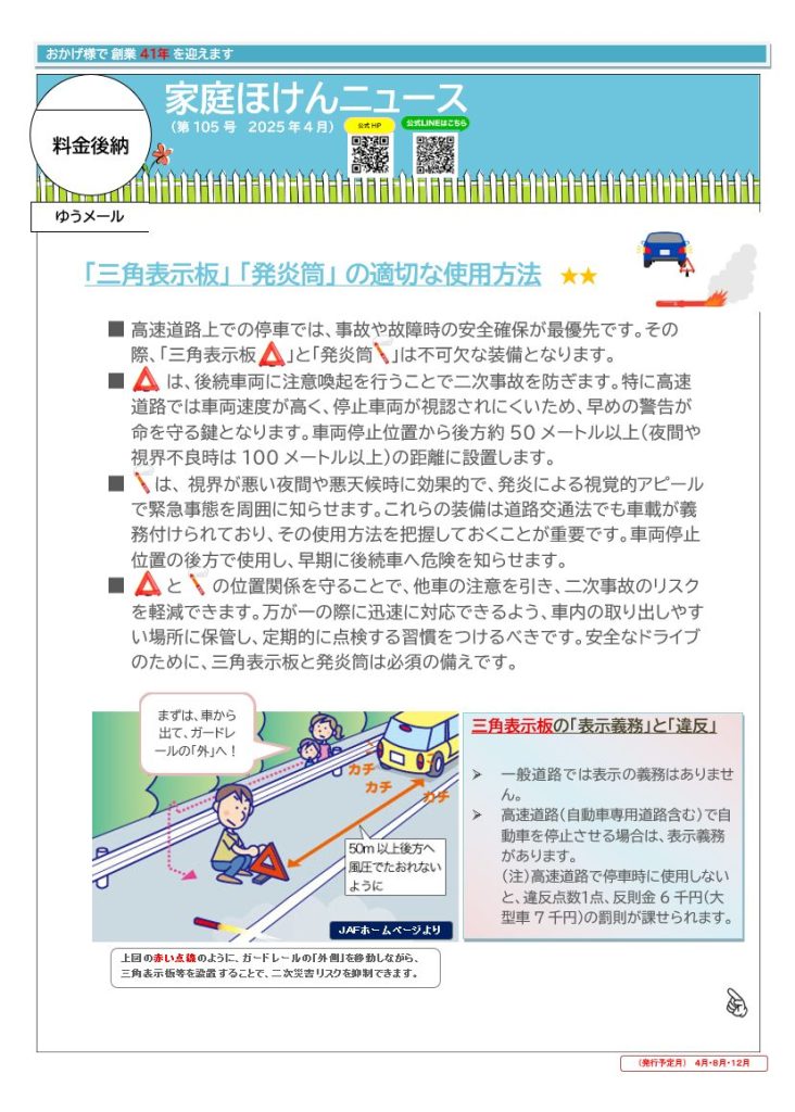 家庭ほけんニュース(105号)4月 ※「三角表示板」・「発炎筒」の適切な使用方法・ 社会貢献への取り組みについて