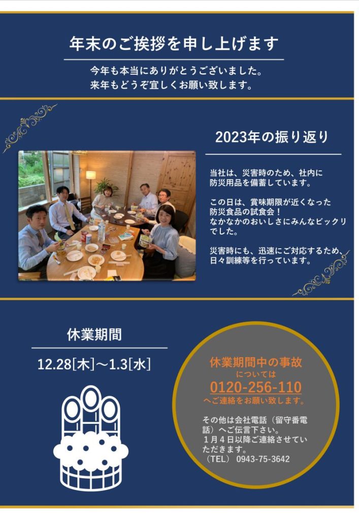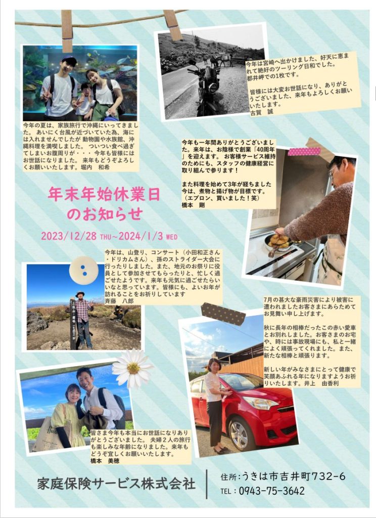 2023.11.27 ほけんニュース 家庭ほけんニュース(101号)12月 ※「7月豪雨災害とBCP計画の重要性」・当社に寄せられた「お客様の声」・年末のご挨拶 年末挨拶状1ダウンロード 年末挨拶状2ダウンロード