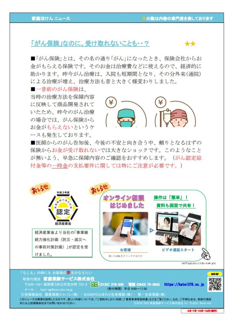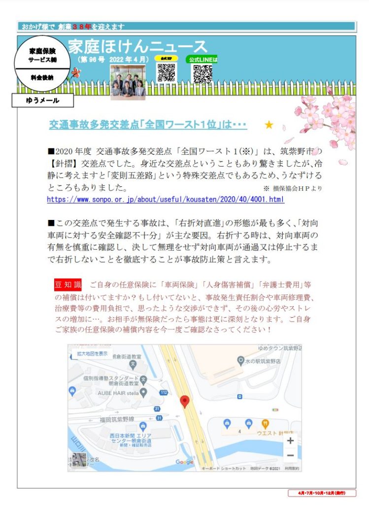 家庭ほけんニュース(96号)4月 ※交通事故多発交差点「ワースト1位」、「がん保険」給付条件に注意